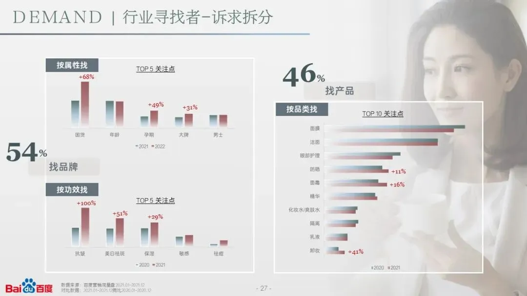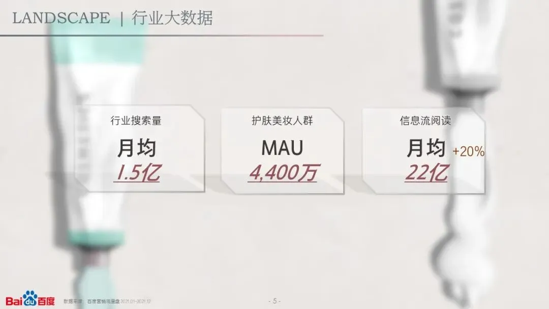 这里主要分享的是3个数据维度。行业月均搜索量为1.5亿次,受用户行为变化等因素的影响,搜索量同比去年下降12%。但与此同时信息流的月均阅读数增加20%,为22亿次/月,越来越多的用户喜欢在百度上浏览行业资讯。而整体行业的MAU达到4400万左右,意味着百度上确实存在着非常多与护肤美妆行业强相关的活跃人群。而正是因为有这么大体量的人群,让我们后续的趋势、需求等分析变得有意义和价值。
