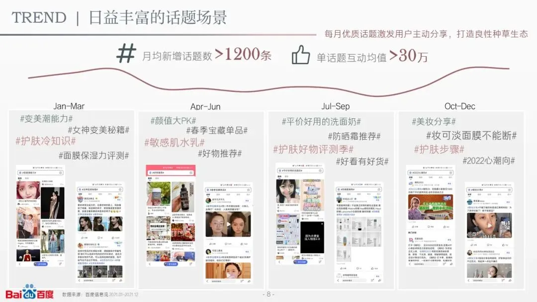 与此同时,以UGC内容输出为主的话题场景也在日益丰富,打造良性的种草生态。每月新增话题数超1200条,单话题互动均值大于30万,年初的3月女神节和年末12月的礼物季是话题参与的高活跃时段。