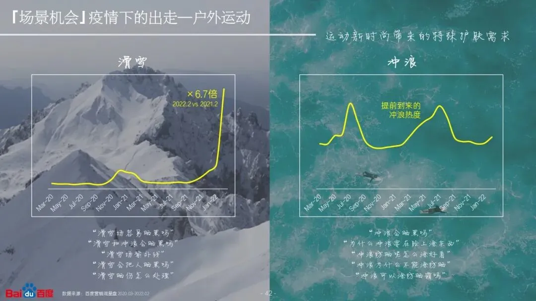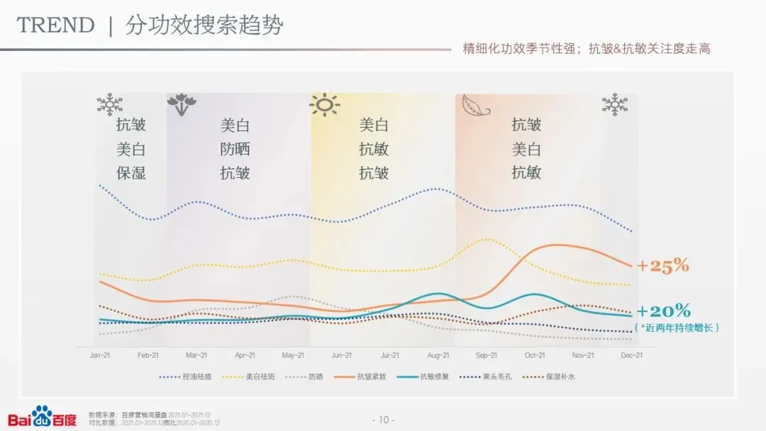 从功效上可以发现,精细化的功效(例如:防晒,美白和抗皱等)都具有较强的季节性。而每个季节,用户也有对应不同的功效诉求偏好。由于受到疫情常态化的影响,抗敏修复持续两年关注度增加。抗皱在去年的搜索占比提升25%。