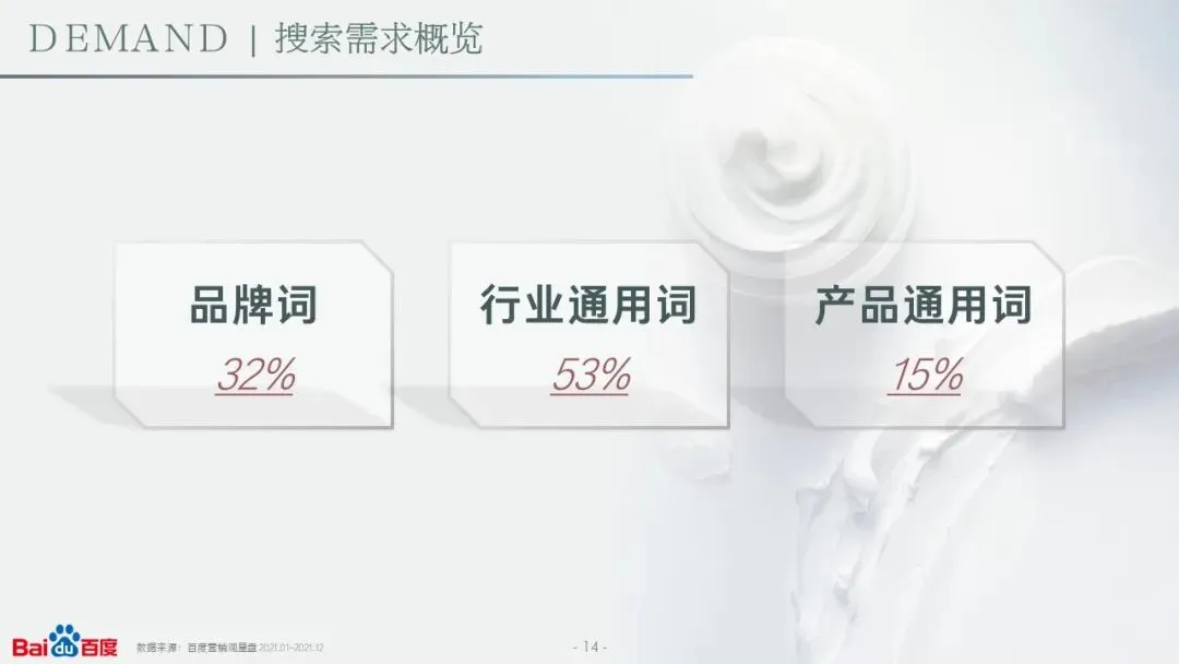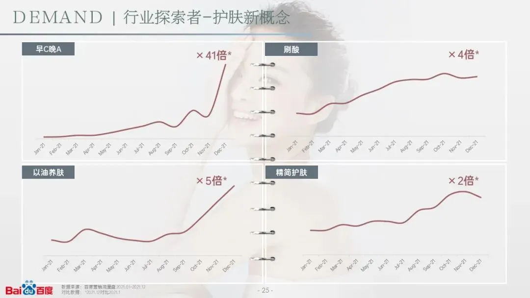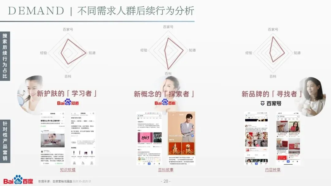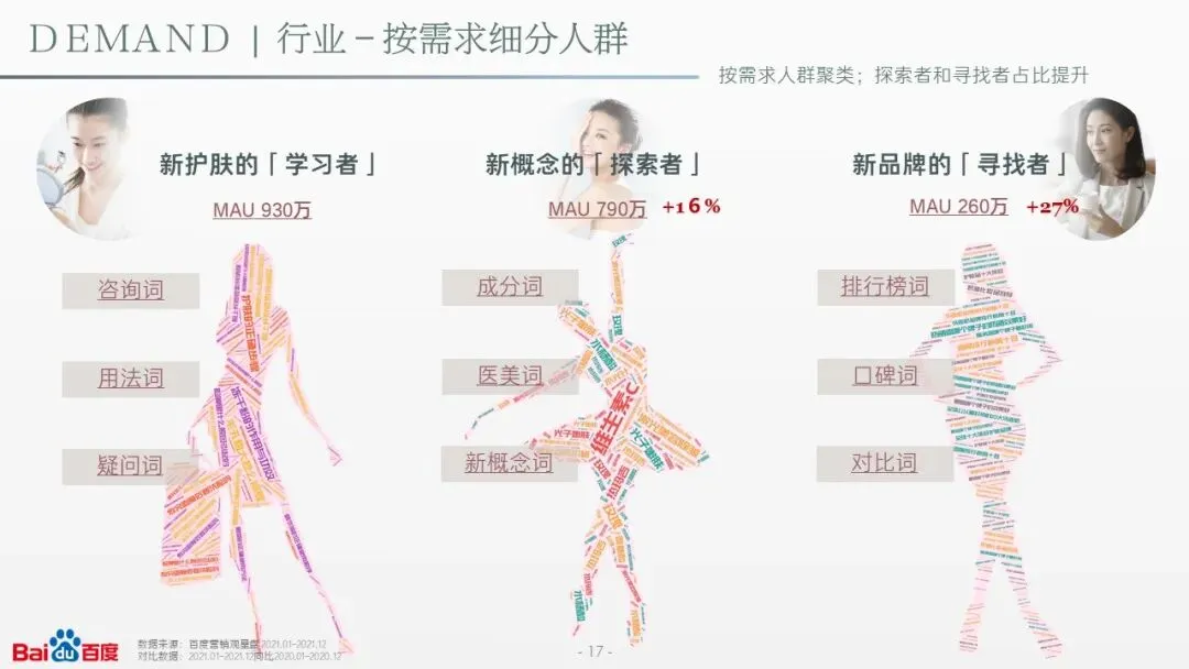 2)新概念“探索者”-以成分词(例:烟酰胺),医美词(例:热玛吉)和新概念词(例:以油养肤)为核心搜索需求的人群,在百度上了解各种最新的护肤信息;