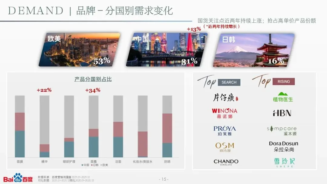 国货品牌的声量连续两年呈现明显的涨势,21年占比同步增长13%。从产品类型来看,去年国货品牌在精华和面霜两个高单价的产品上不断抢占日韩和欧美品牌的份额。表明国人对于国货品牌的信心度在增加。