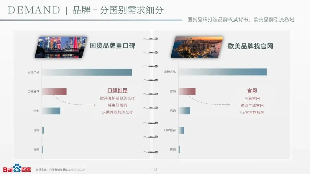 而欧美品牌的搜索人群更多的在百度上寻找品牌的官网,将百度购买或了解产品的入口平台之一。所以对于欧美品牌来说,在百度上的官网阵地搭建以及私域运营变得更为重要。