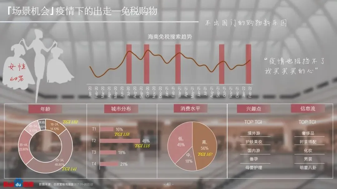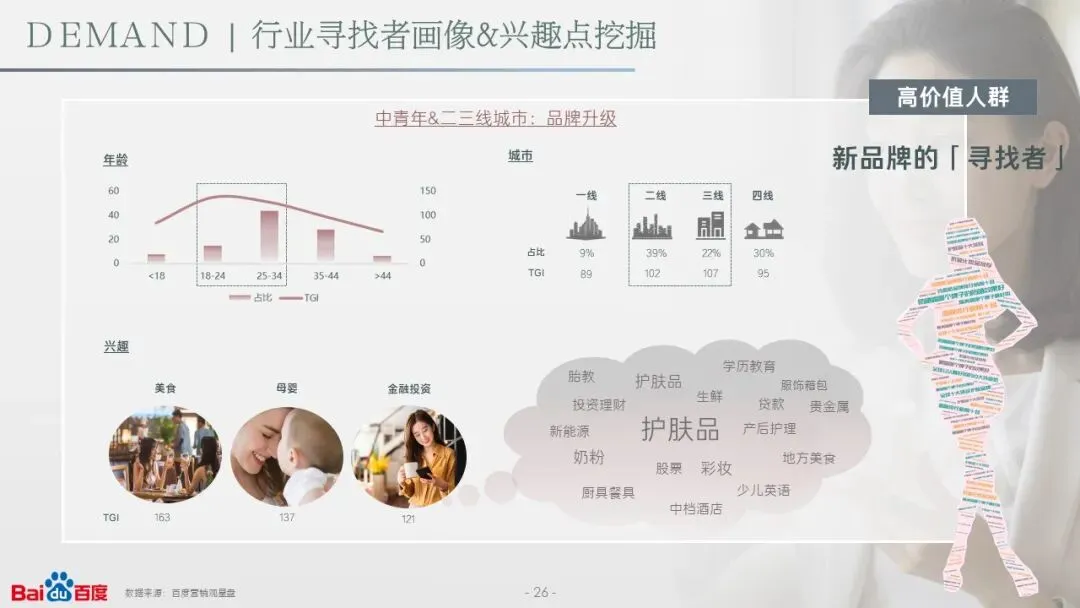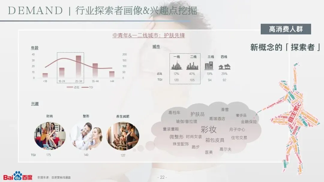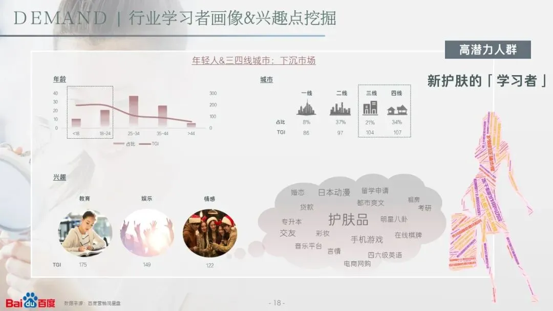 他们应该是品牌主最关注的一群人了,更多的是一群生活在二三线城市的中青年,想要在护肤品牌和产品上做一些新的尝试,并希望借助于百度上的内容和资讯给到他们建议。他们是更容易被搜索内容影响心智,且离最终的转化行为更近的高价值人群。