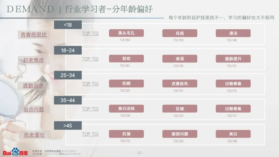 而有意思的是,如果结合年龄和功效来看用户的偏好,会发现不同年龄阶段在护肤上的困扰不一,学习的诉求也会大不相同。