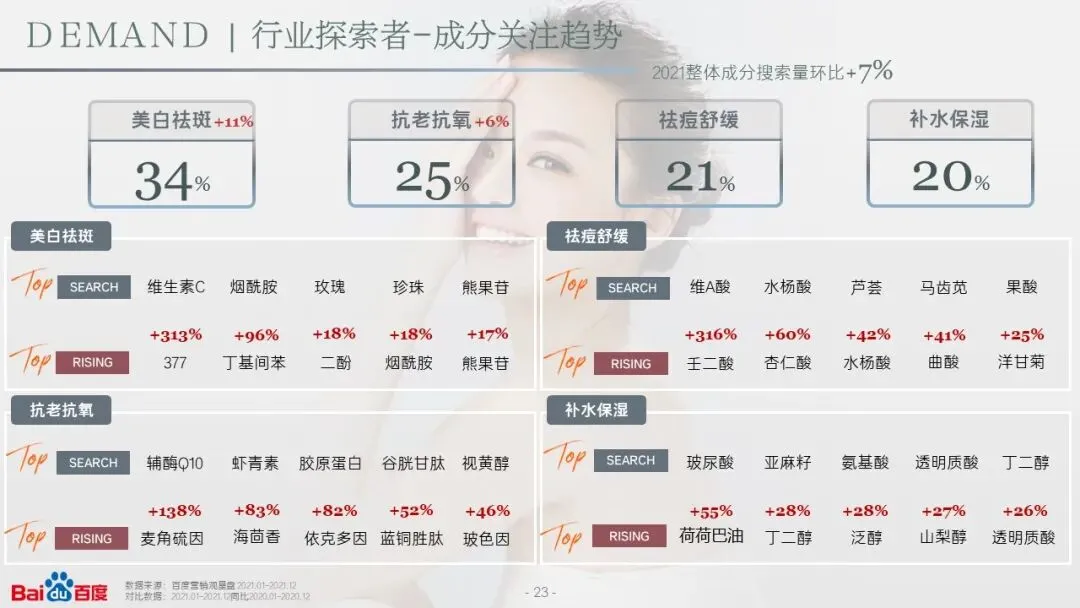 在他们中,“成分党”越来越多,整体成分相关搜索词在21年增长7%。“377”成分的争议、麦角硫因和蓝铜胜肽等“新网红”的出现,带动了美白和抗老相关成分关注度走高。