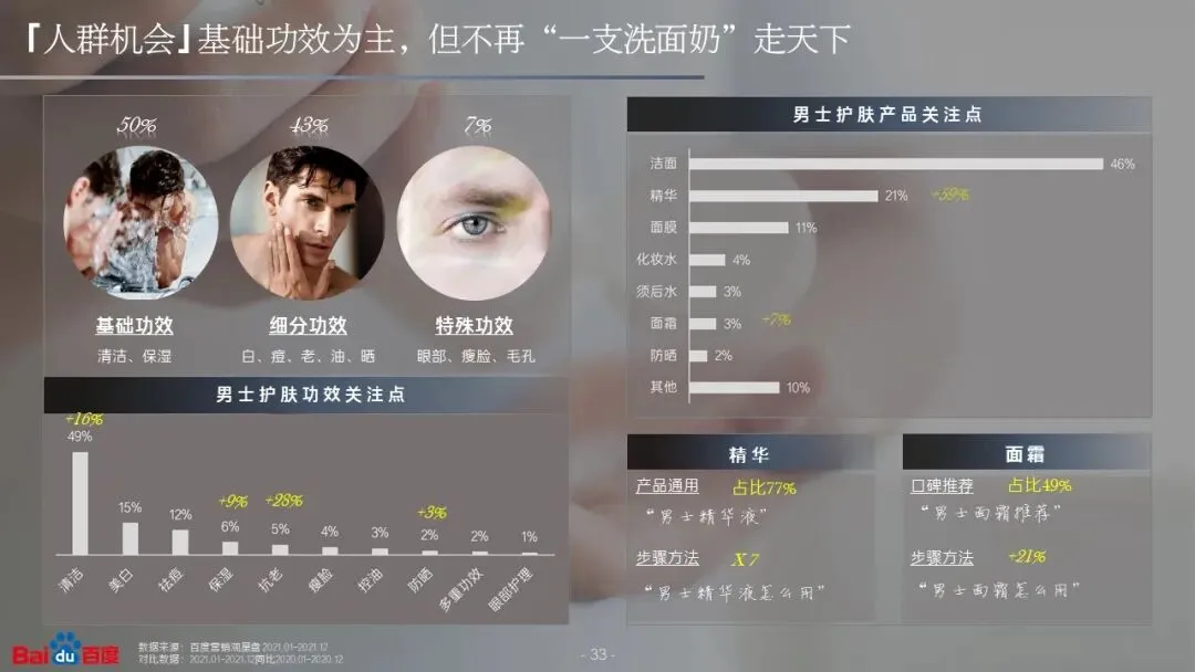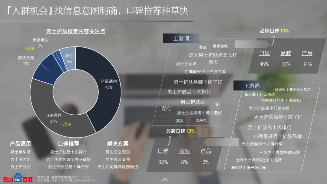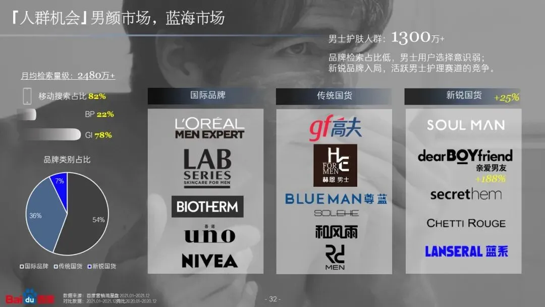 百度汇聚的1300万护肤男士,月均发出2480万次检索需求。相比起护肤整体32%的品牌词搜索占比,男士22%的品牌词搜索占比反映出男士护理的选择品牌池相对局限的现状。