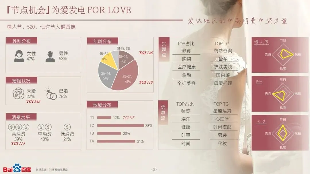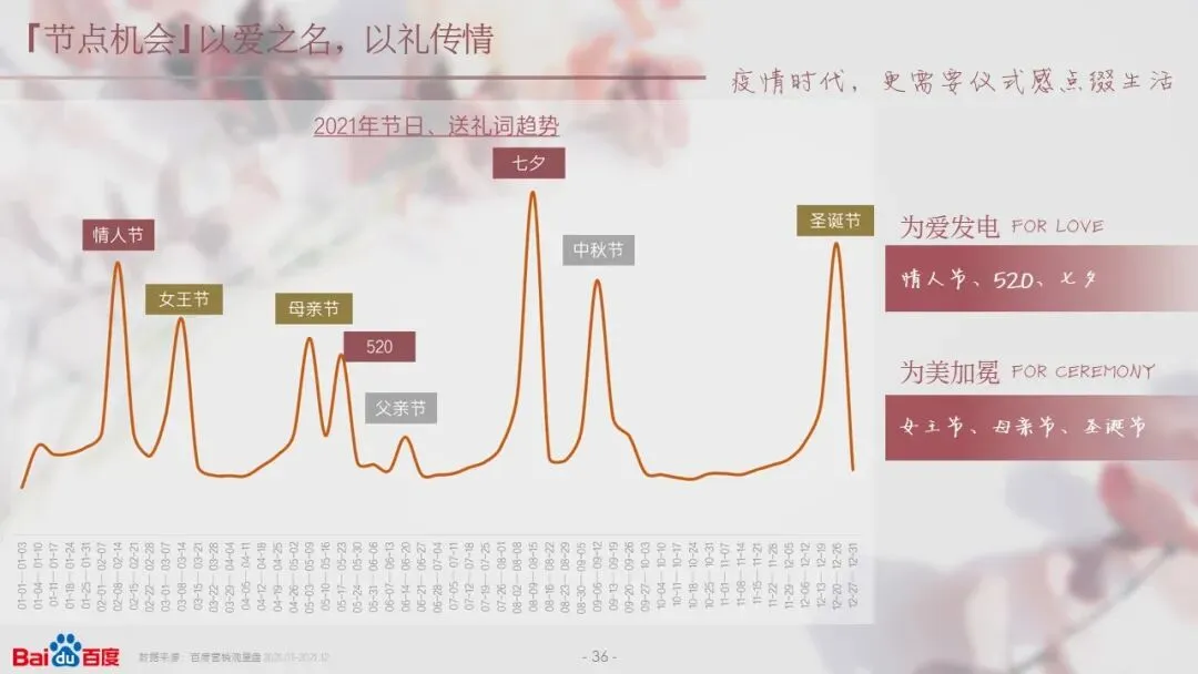 其中,「为爱发电」的西方情人节、520、七夕和「为美加冕」的女王节、母亲节、圣诞节是最受消费者重视的节点。