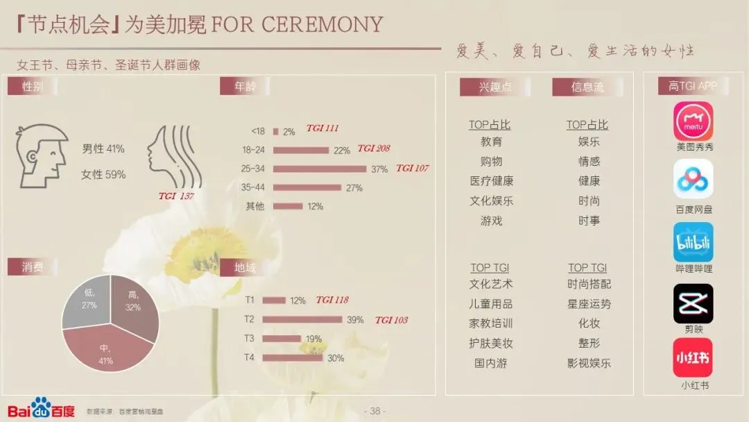 而「为美加冕」则更多是爱美、爱自己、爱生活的女性,占比59%。她们集中在34岁以下的年龄段,活跃在发达城市,兼顾着教育小孩、照顾家庭和关爱自己的多重身份。