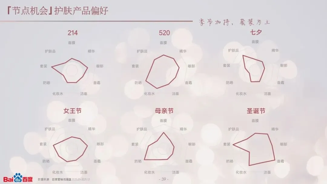 品牌自然也会把握机会在这些节点推出限量款单品、定制礼盒套装等,进一步迎合消费者的仪式感。而我们从分析中也可以看出不同节日的护肤选购偏好不一,共性是不知道选什么才好的时候,包装精致、诚意满满的套装总是错不了。