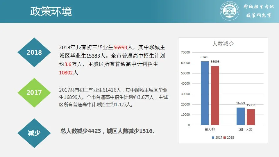 根据聊城市教育局发布的信息,2018年聊城中考人数同比减少9%,减少人数1516,本届学生进入普通高中机会增加,竞争激烈程度相对降低。
