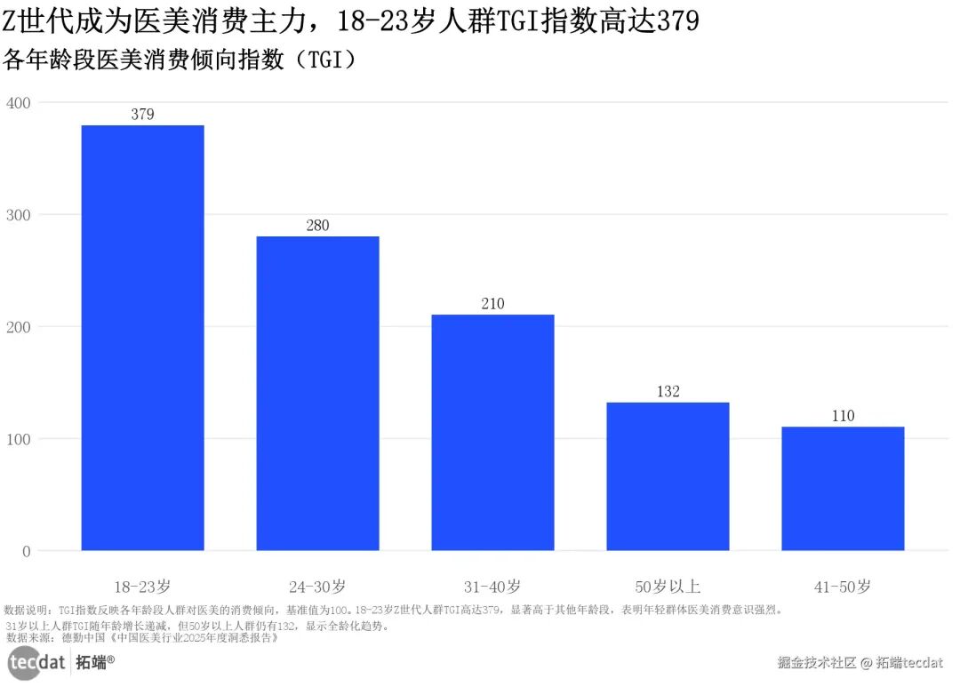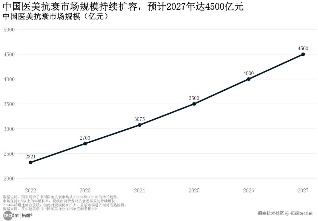 医美市场中,抗衰赛道是绝对的“增长引擎”——2024年市场规模达3075亿元,预计2027年将突破4500亿元,年均增速保持15%以上。这一增长来自“两代人群”的需求叠加:18-23岁Z世代主打“抗初老”,偏好光子嫩肤、酸类焕肤等“无创、恢复期短”的项目(TGI指数高达379),把医美当成“日常保养”;31-40岁熟龄肌则追求“深度抗衰”,热玛吉、超声炮等项目需求旺盛,推动高端医美市场(客单价5000元以上)增速达22%。