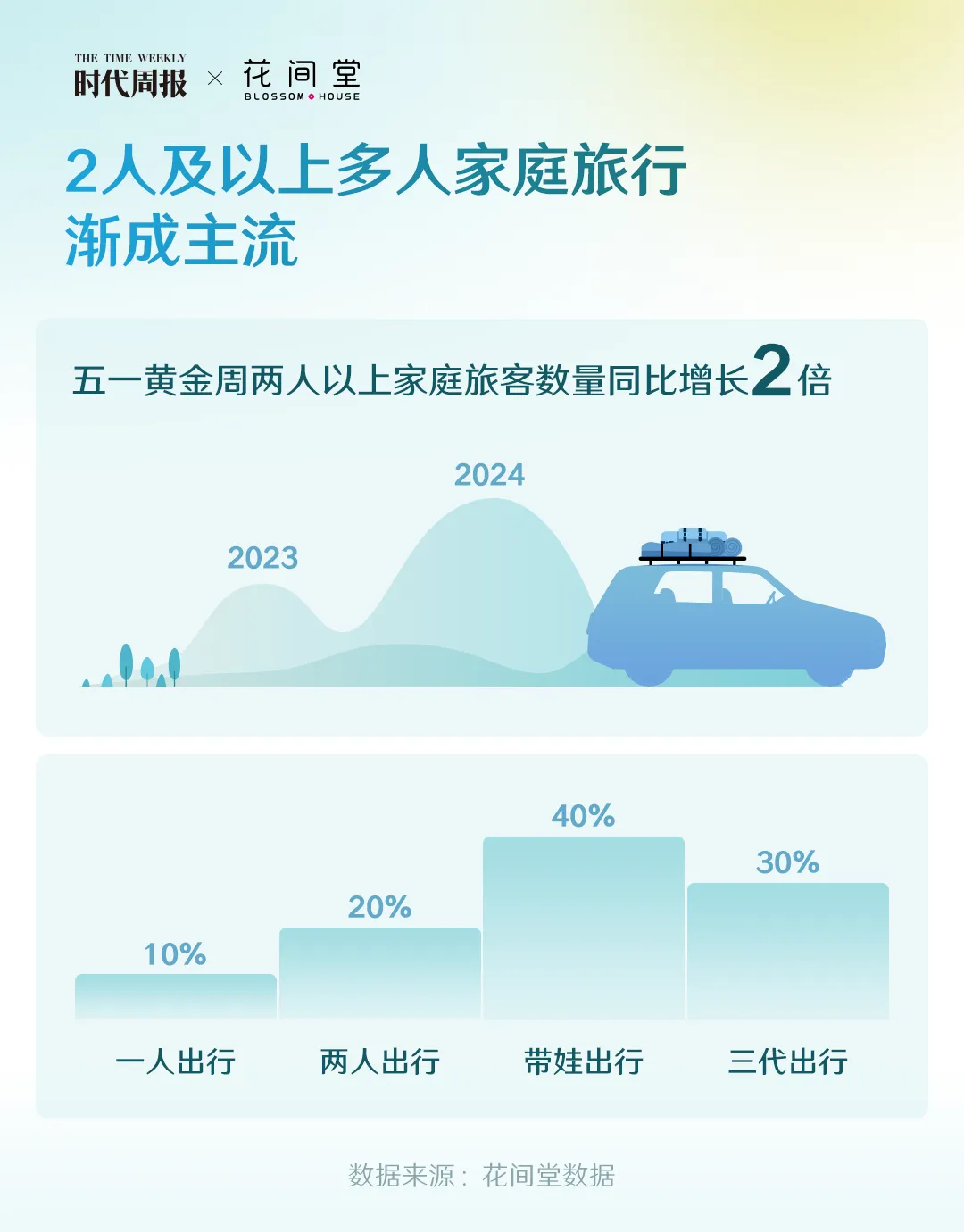 根据花间堂数据,当下多代家庭旅行呈现增长趋势,两人及以上的家庭旅客数量是春夏季热度提升最快的出游类型,在“五一”黄金周期间同比增长超2倍。
