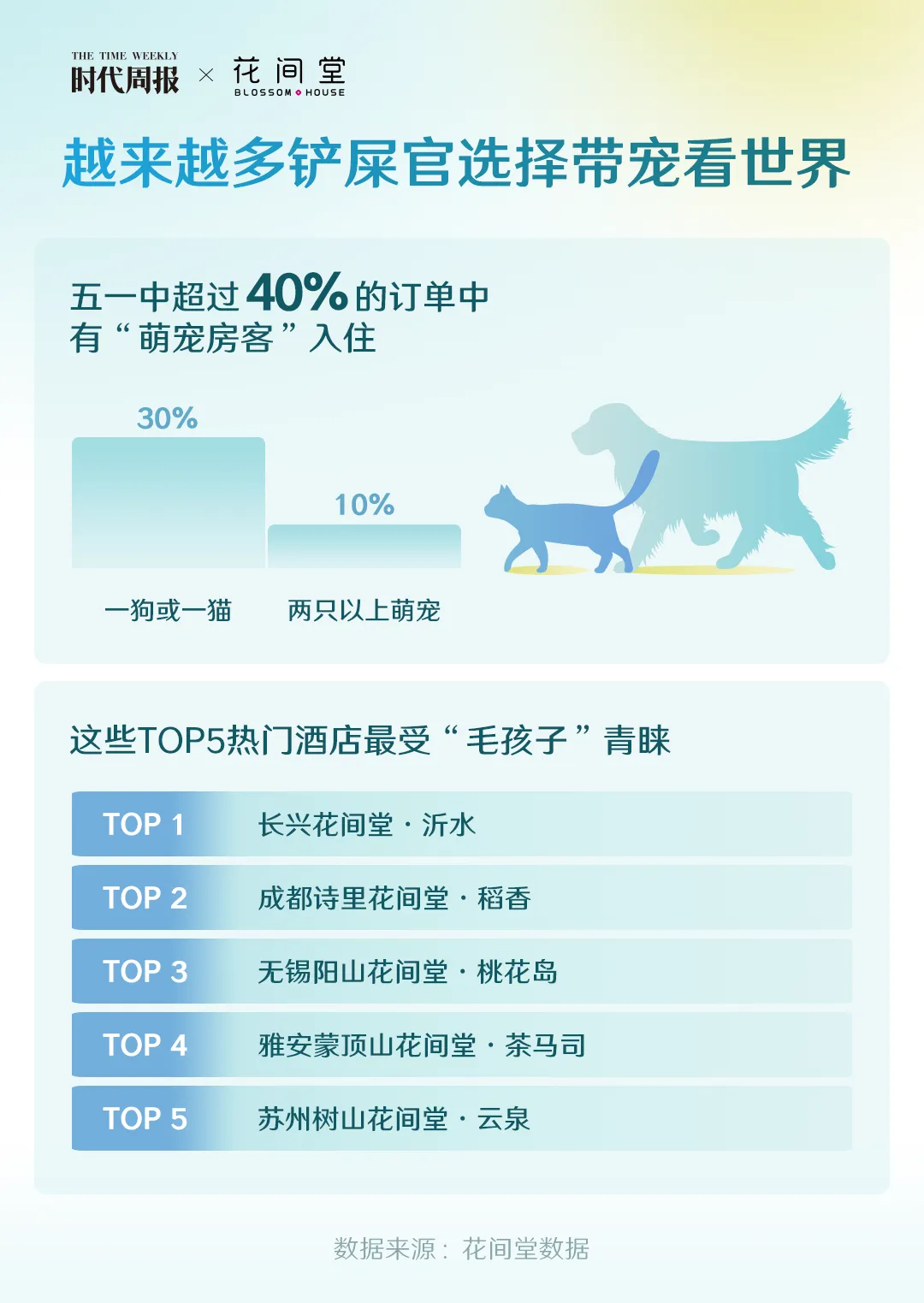 寄养宠物不再是假期出行时的单一选择,“铲屎官们”希望在出游中同样能陪伴毛孩子。花间堂数据显示,“五一”小长假中超过40%的订单中有“萌宠房客”入住。
