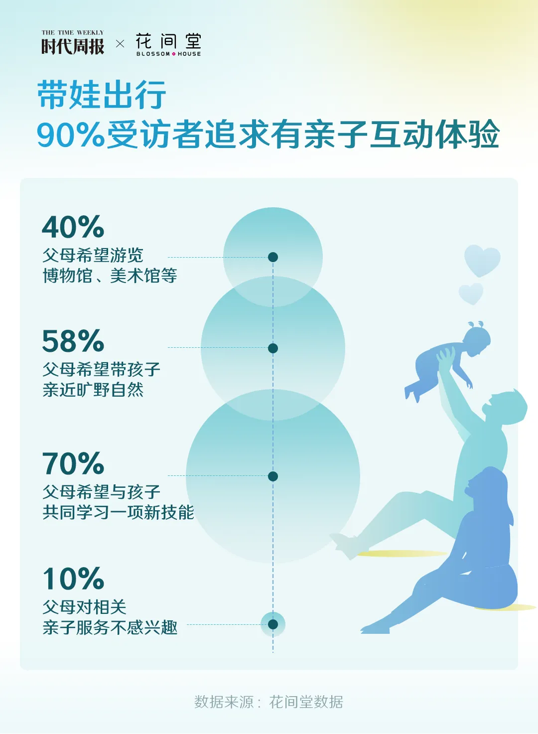 报告显示,40%的父母希望游览博物馆、美术馆等,58%的父母希望带孩子亲近旷野自然;70%的父母则希望与孩子共同学习一项新技能;仅有10%的父母对相关亲子服务不感兴趣。