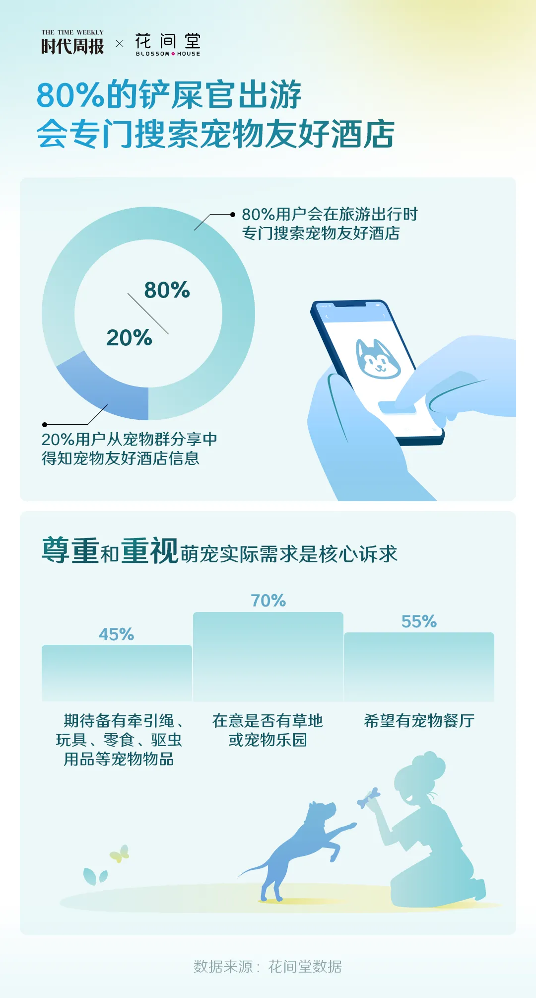 能否从“心”出发理解宠主与萌宠的心理与实际需求,也是带宠家庭极为关注的细节。据花间堂数据,有55%花粉希望有宠物餐厅,45%期待备有牵引绳、玩具、零食、驱虫用品等宠物物品;还有70%则在意是否有草地或宠物乐园,让毛孩子们在户外空间中共享欢乐时刻。