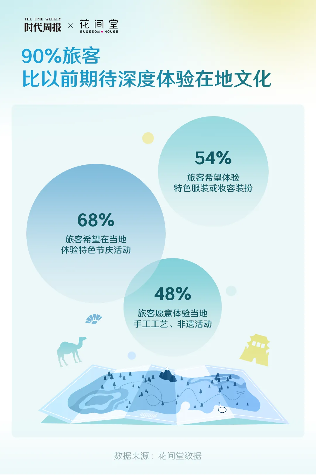 属地文化体验能够为消费者带来更加极致的旅行。花间堂数据显示,相比疫情前,如今90%的旅客更加期待参与当地的节庆文化,深度体验在地的文化体验。