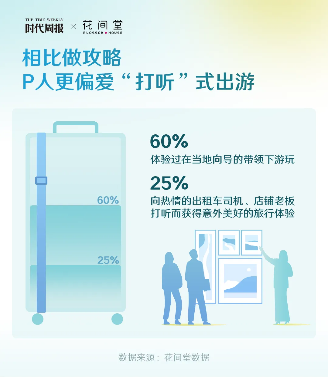 根据花间堂调研数据,越来越多的旅客开始尝试“只选择目的地,不做攻略”,其中超过60%的花粉体验过在当地向导的带领下游玩;有25%的人则通过向热情的出租车司机、店铺老板打听而获得意外美好的旅行体验。