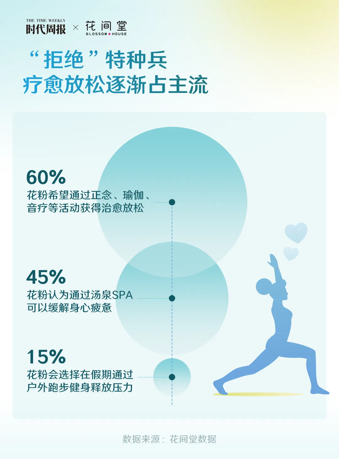 根据调研,在旅游度假中,45%的花粉认为通过汤泉SPA可以缓解身心疲惫,60%的花粉则希望通过正念、瑜伽、音疗等活动获得治愈放松,仅有15%的花粉会选择在假期通过户外跑步健身释放压力。