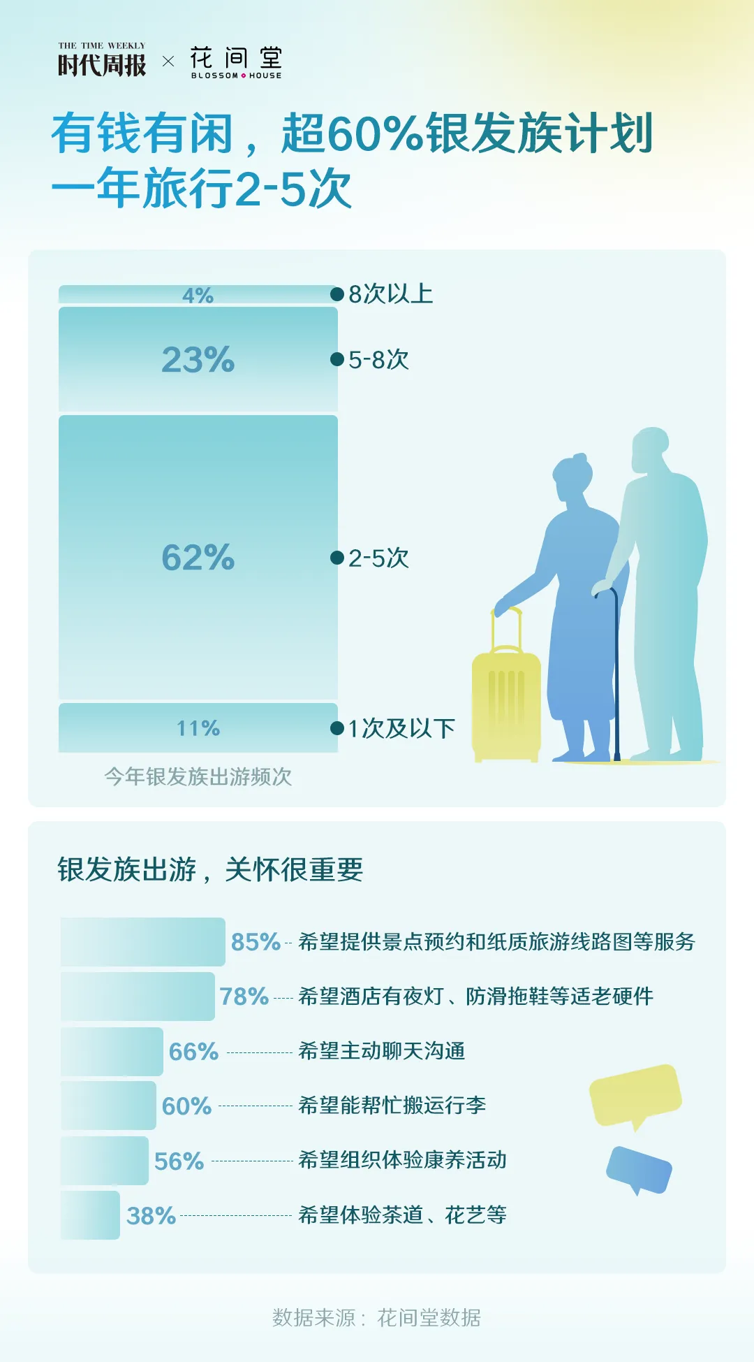 根据花间堂数据,60岁以上的银发旅客已占花粉数量的15%以上,成为增长最迅猛的客群。在今年花间堂入住数据中,银发族出行订单增长了20%。对于今年的旅游规划,11%的银发族出游频次计划在1次及以下,62%在2-5次,23%在5-8次,甚至有4%在8次以上。