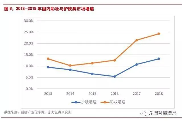 根据欧睿咨询数据显示,2018年国内化妆品市场中护肤品增速为13.2%,彩妆市场增速从2013年的13%进一步提升至2018年的24.3%,增速呈现进一步加快的趋势。