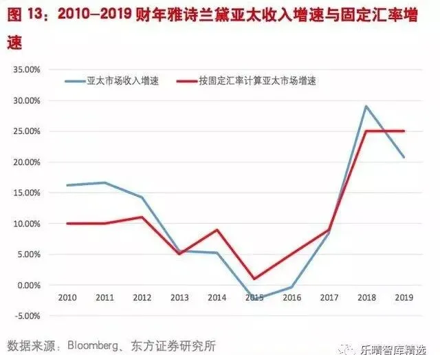 依靠小棕瓶等明星单品的持续换代升级与旗下高端护肤、彩妆品牌的快速增长,雅诗兰黛集团2018~2019财年亚太市场按照固定汇率计算的收入增速达到25%,是2006年以来最快增速。