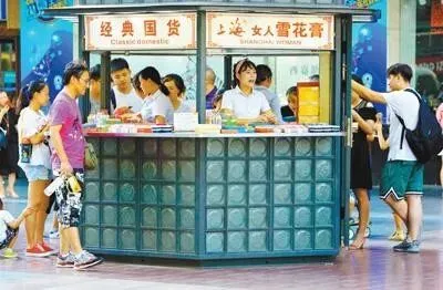 上海南京东路步行街,不少顾客在专卖“雪花膏”化妆品的小商铺挑选化妆品。