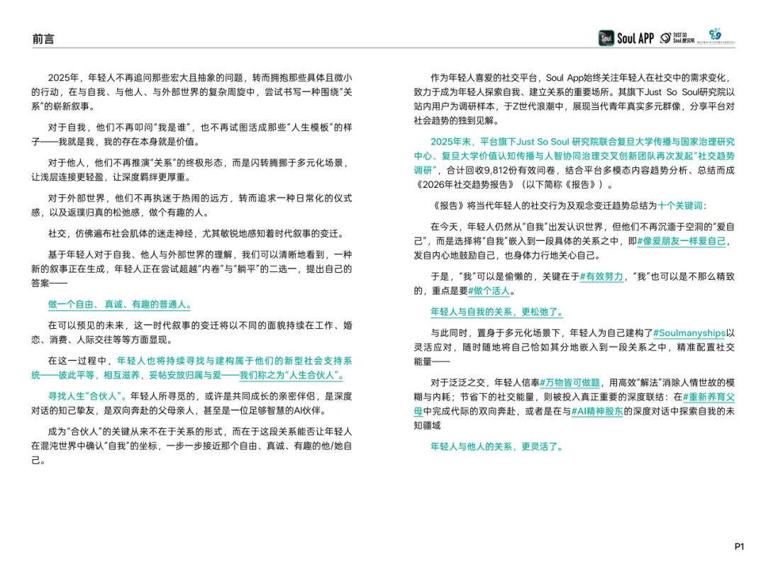 近日,Soul APP 发布《2026年Z世代社交趋势报告》。报告基于 9812 份有效问卷及平台内容分析,提炼十大核心关键词,揭示 Z 世代 “自由、真诚、有趣” 的社交新主张,为品牌社交营销与产品创新提供参考。