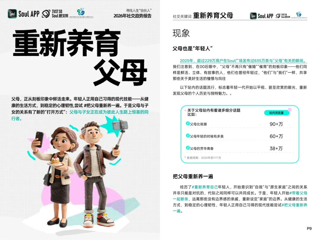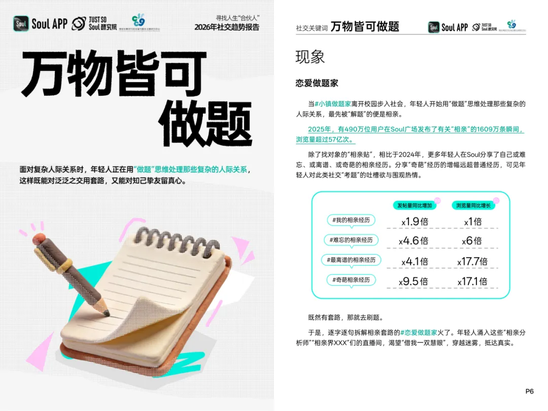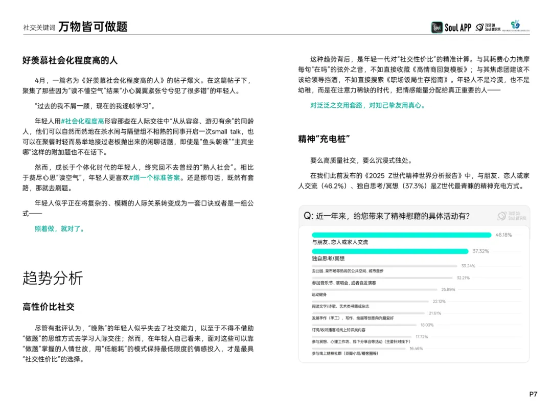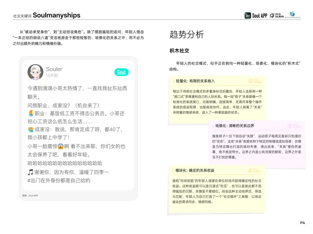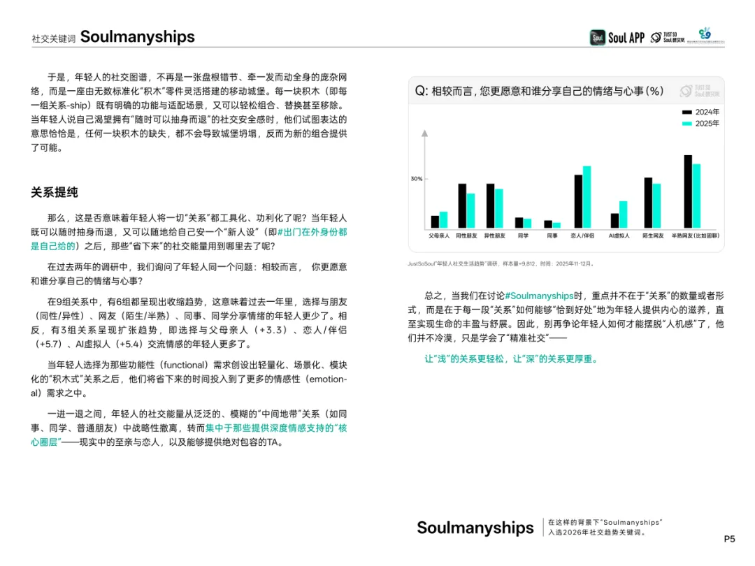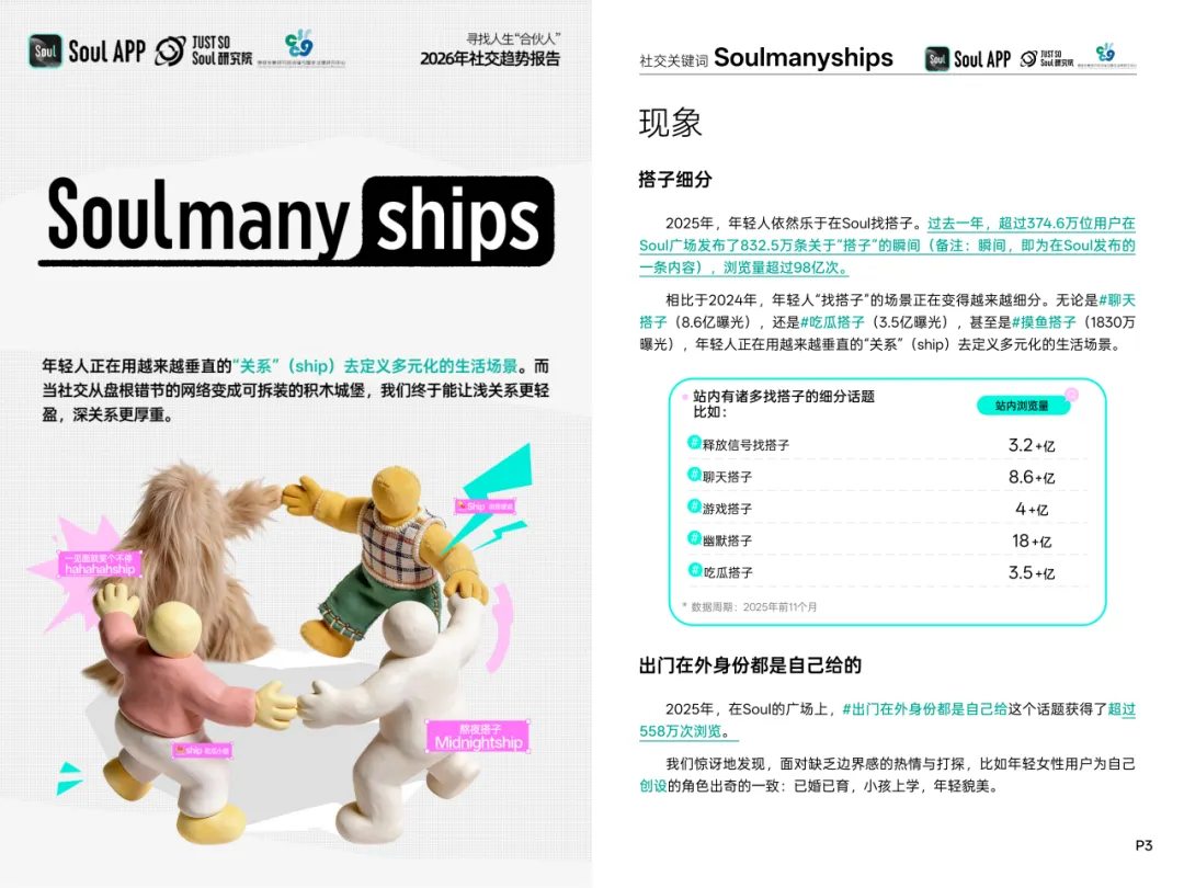趋势①:关系模块化,Soulmanyships 灵活适配场景Z 世代热衷 “搭子社交”,聊天、游戏、吃瓜等细分场景标签曝光量居高不下;社交模式转向 “积木式”,浅关系功能明确、边界清晰,省出的能量聚焦家人、恋人等核心圈层,实现 “浅关系更轻,深关系更重”。