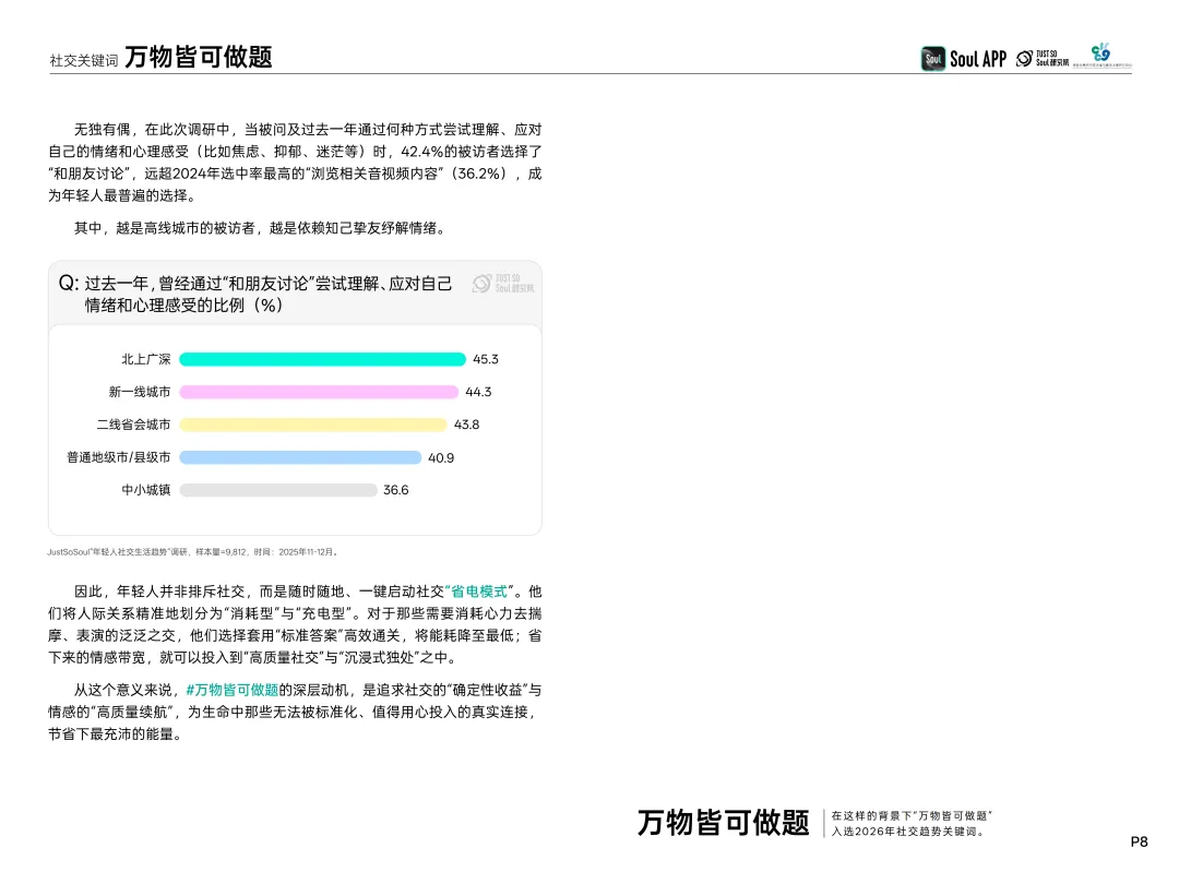 情绪能量稀缺:面对工作生活压力,年轻人倾向 “低耗社交”,将有限精力投入高价值关系与自我关怀;