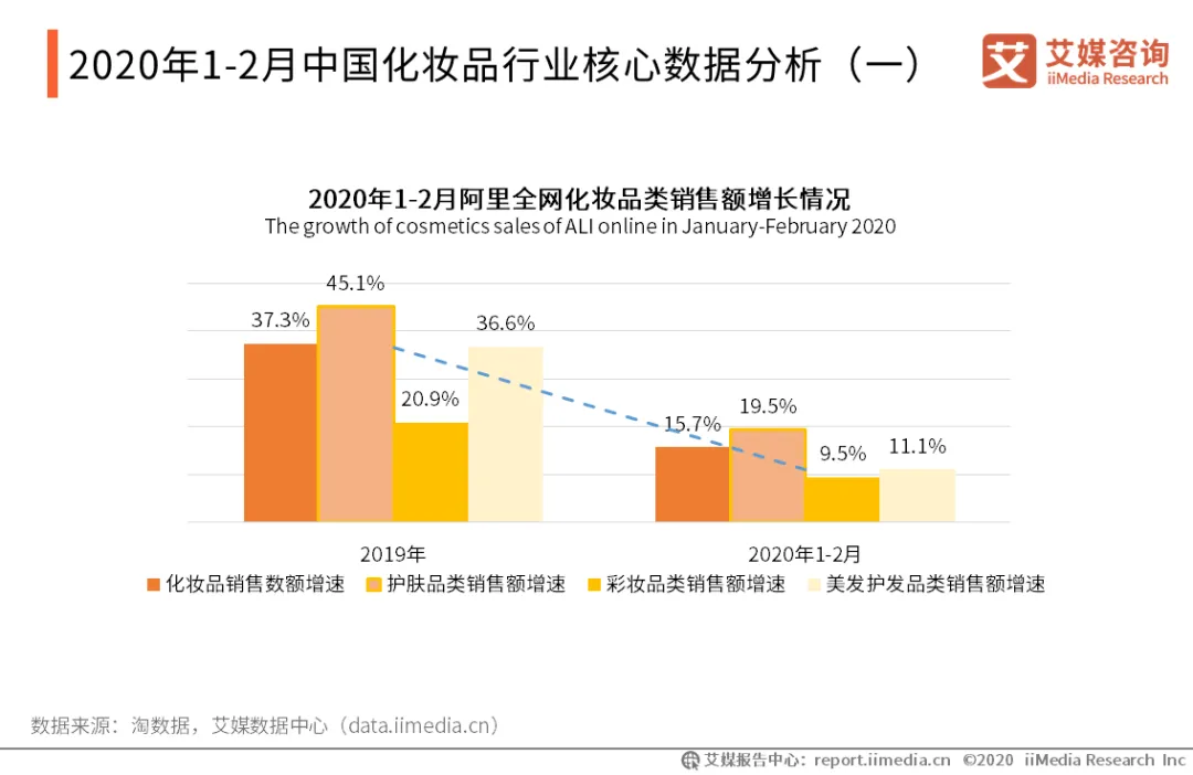 从2020年1-2月阿里全网化妆品类销售数据增长情况可以看到,2020年各品类的销售额相比于2019年全年增速均有所放缓,其中,2020年1-2月阿里全网化妆品销售额增速较2019年全年增速放缓了21.6%。