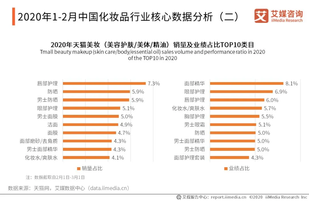 据2020年美妆护肤/美体/精油大类的线上销量与业绩数据来看,销量占比最多的类目是唇部护理,达7.3%;而从业绩占比角度看,面部精华类目的业绩贡献最大,占比达8.1%。