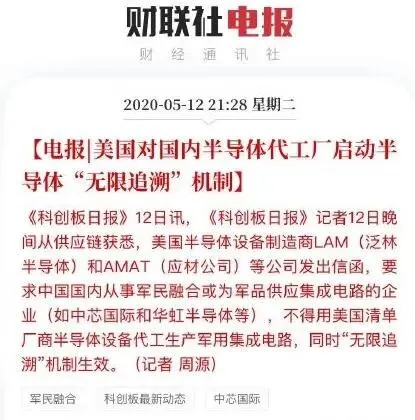 随着5月15日美国对华为临时许可证限期将到期,市场有关美国将加大对国内半导体代工厂限制的禁令声再起。5月12日晚,一条关于半导体的新闻在网络广泛传播。据《科创板日报》报道,美国半导体设备制造商LAM(泛林半导体)和AMAT(应材公司)等公司发出信函,要求中国国内从事军民融合或为军品供应集成电路的企业(如中芯国际和华虹半导体等),不得用美国清单厂商半导体设备代工生产军用集成电路,同时“无限追溯”机制生效。