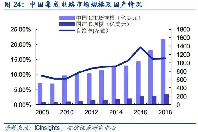 我国芯片市场现状:国内IC市场规模大,自给能力不足;中低端产品发展迅速,细分领域实现突破,核心受制于人
