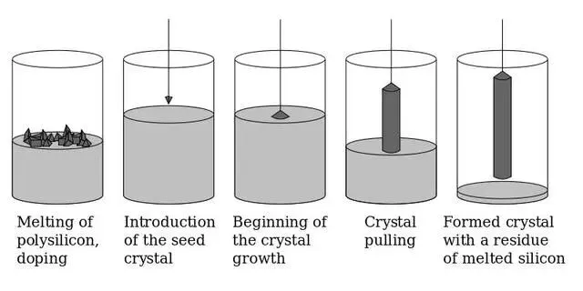 制造硅片大概需要以下三个步骤:纯化、拉晶、切割。主要难度在拉晶这个环节,拉晶就是将纯化得到的多晶硅融化,用单晶硅种接触液面表面,然后旋转拉升,得到单晶硅柱。做出的晶柱越粗,可切出的硅片直径越大,芯片制造时的效率就会更高。