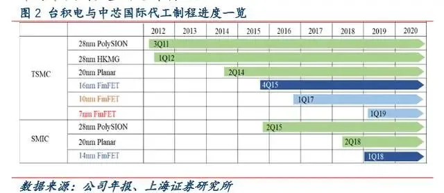 有些芯片公司只做设计(Fabless),并没有自己的工厂(Foundry),因此要找制造企业代工。台积电是全球Foundry中的绝对霸主,一家拿到了50%的份额,台积电先进制程的开发进度几乎决定了行业的发展速度。目前台积电已经试产了5nm,三星为了与台积电竞争,称要研发3nm制程。大陆工厂与台积电的差距大约在2代以上,最先进的中芯国际今年一季度刚刚可以量产14nm制程,目前正抓紧攻克12nm;至于排行老二华虹半导体,距离先进制程仍有距离。