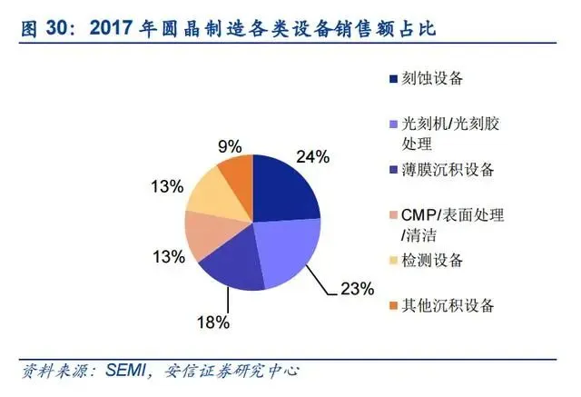 所有的生产都离不开设备,IC对设备的依赖更强。设备可分为晶圆制造设备、封装设备和测试设备等。晶圆制造设备又分为刻蚀机、光刻机、薄膜沉设备、CMP设备、检测设备等。