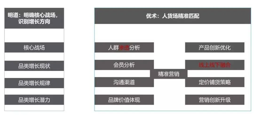 这一环节中,重点是对人的分析,只有充分了解消费人群,货、场才能有效做起来。对人的分析,主要包括人群渗透分析、会员分析,通过分析渗透率、会员情况、占有率、消费能力、流失情况等等,以此为基建立与会员的沟通渠道,强化品牌建设,实现精准营销。