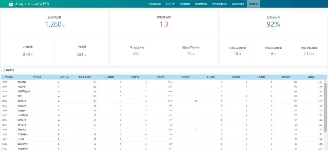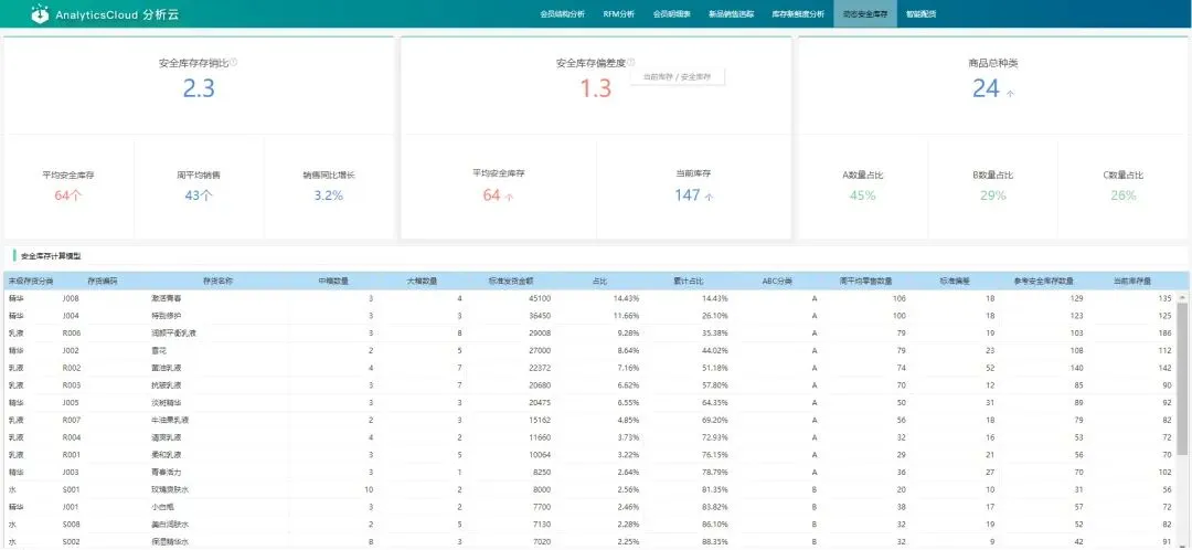 分析云安全库存动态模型,满足不确定因素导致的更高的库存预期。根据商品的贡献度情况、销售速度、发货速度、偏差情况等计算出安全库存值,实现安全库存动态管理。