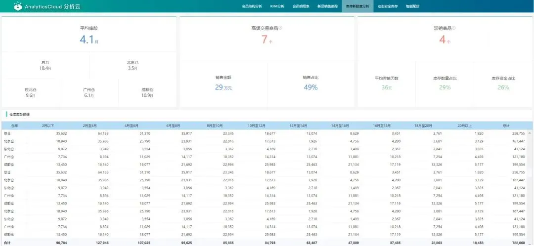 库存鲜度分析,主要分析了近期库存成本控制是否合理,库存积压情况、营销与配货、补货是否均衡,库龄与商品效期比对,结合会员策略,提前部署区域/商品促销措施。