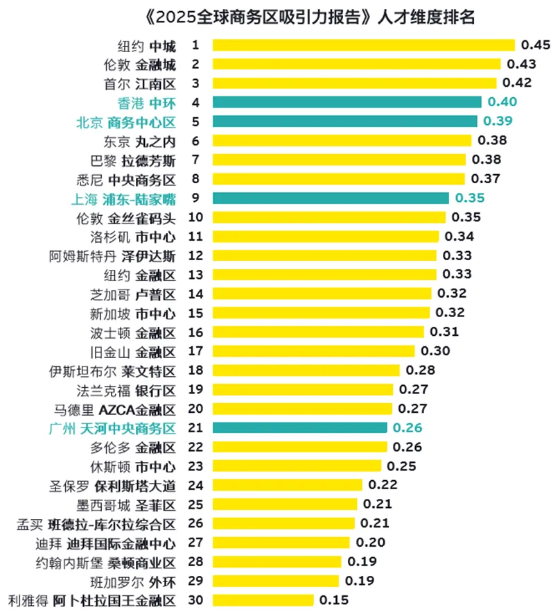 《2025全球商务区吸引力报告》指出,全球商务区的核心吸引力依然取决于其吸引和留住高端人才的能力,“人才吸引力”体现了一个商务区的发展潜力。科技人才储备规模是是亚洲商务区的核心竞争力,也是企业布局选择的关键因素。在此维度上,中国商务区表现尤为突出,排名显著提升:北京CBD在该维度排名全球第五,较2020年上升10位;上海浦东陆家嘴排名全球第九,较2020年上升9位。