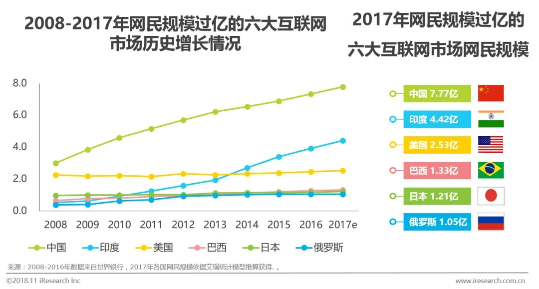 2017年,中、印、美分别以7.77亿、4.42亿和2.53亿网民规模分居全球网民规模TOP3,除此之外,巴西、日本和俄罗斯三国的网民规模也均超过一亿。与2008年相比,长周期中,网民过亿的六大互联网市场中,网民扩张最为迅猛的除中、印两个“知名人口大国”外,还有“战斗民族”俄罗斯,三者的复合增速分别达到11.2%、26.7%和11.9%。而与2016年相比,短周期中,网民过亿的六大互联网市场中,网民增长最快的则分别是印度、中国和巴西,增长率达到13%、6%和5%。