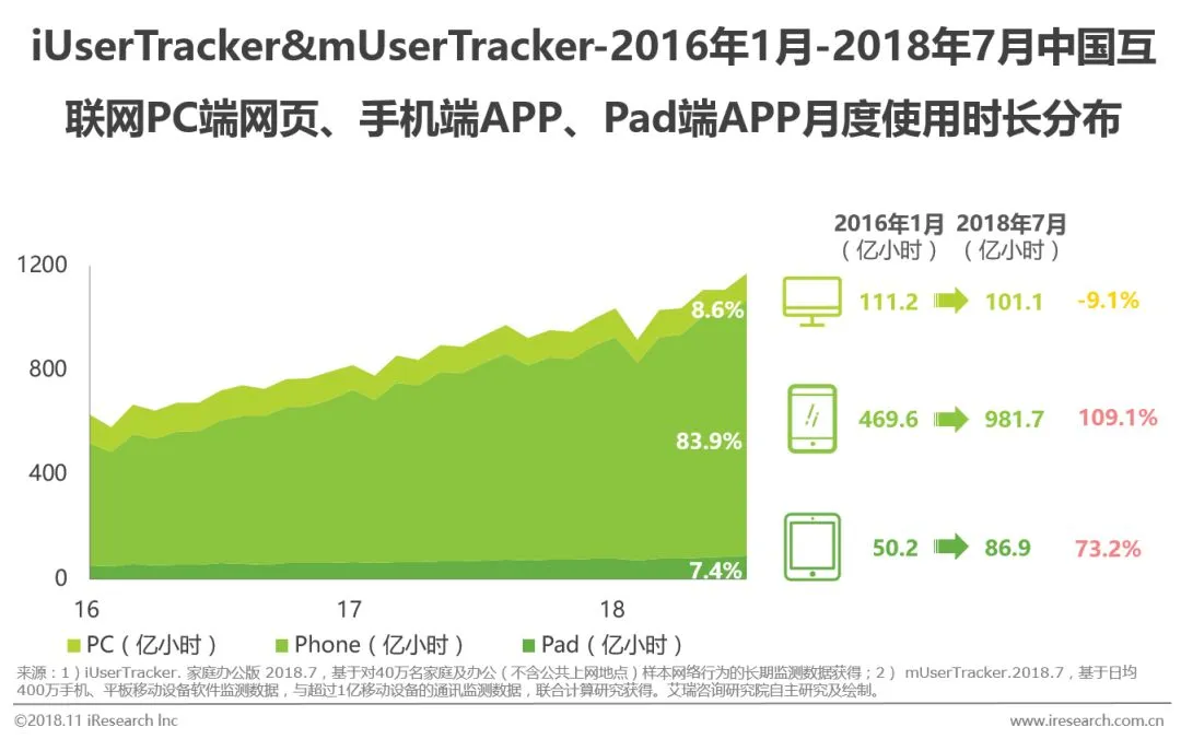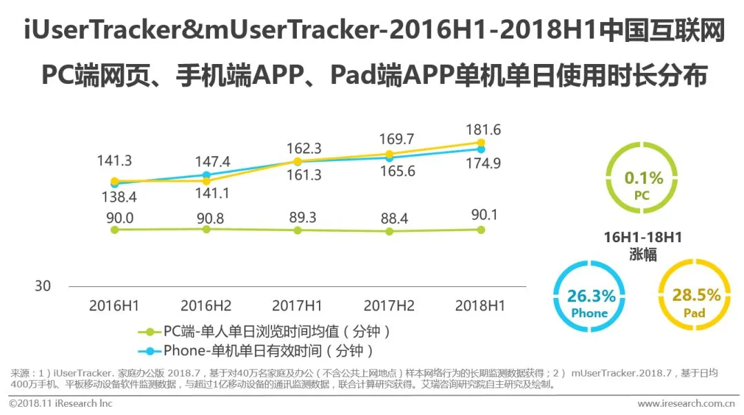 根据艾瑞数据监测产品iUserTracker及mUserTracker数据显示,2018上半年,手机端、Pad端及PC端的单机单日使用时长均值分别达到181.6、174.9和90.1分钟,移动端上网时长已基本达到PC端的两倍,不过仍有相当一部分用户受到使用习惯和功能完备程度的影响,仍较为深度地沉淀在PC端。