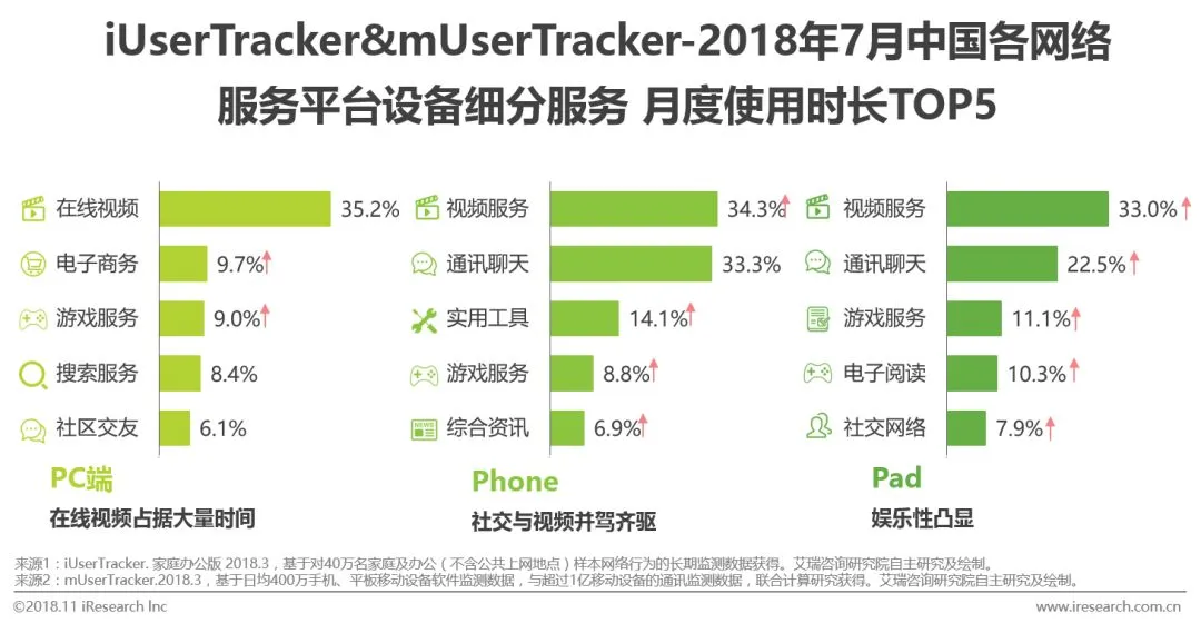 4)由视频、游戏、阅读等构成的泛娱乐网络服务的三端月度使用时长占比均超过40%,其中,Pad端甚至超过了55%。在经济结构由生存型向发展型转型的过程中,居民精神消费需求扩张,对于文化娱乐类服务的关注度提升明显。
