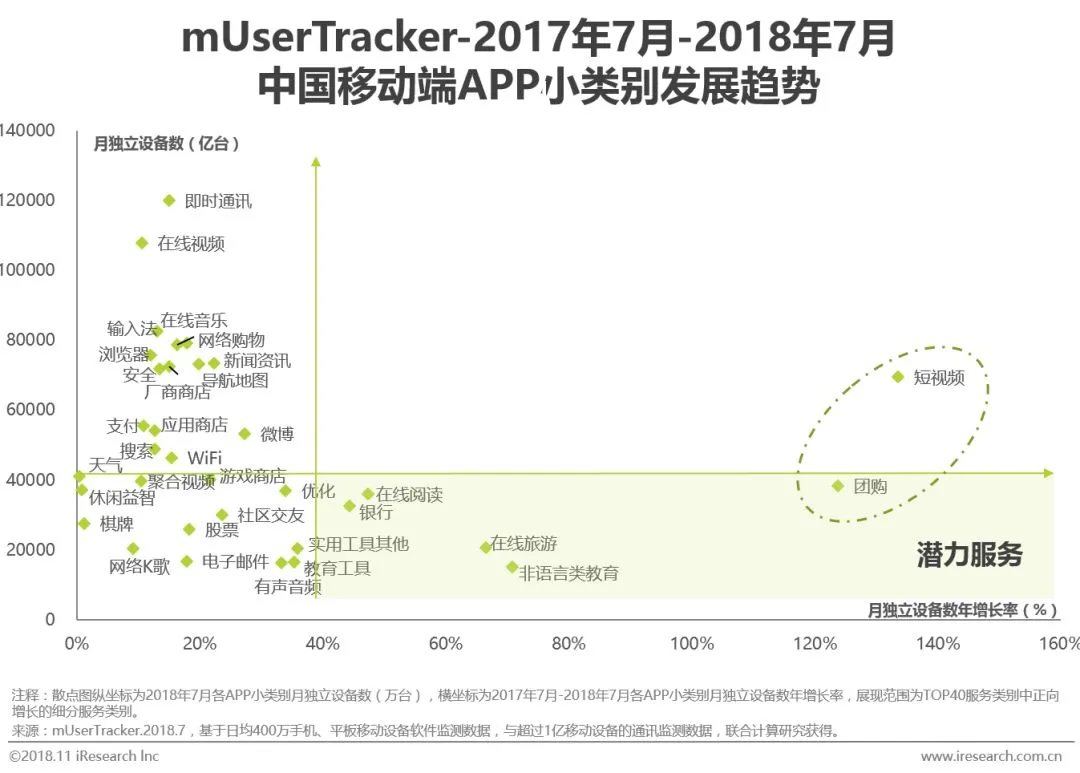 根据艾瑞数据监测产品mUserTracker数据显示,2018年7月独立设备数最多的细分服务类别是即时通讯和在线视频,而相较于去年同期增幅最大的细分类别是以抖音、快手等为代表的短视频类应用和以拼多多等为代表的团购类平台。此外,月独立设备数较低但增速较快的潜力服务,除高增速的团购外,还包括了在线阅读、银行类、在线旅游和非语言类教育等细分服务类别。