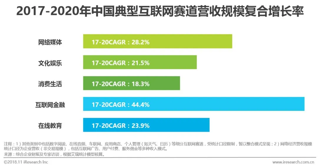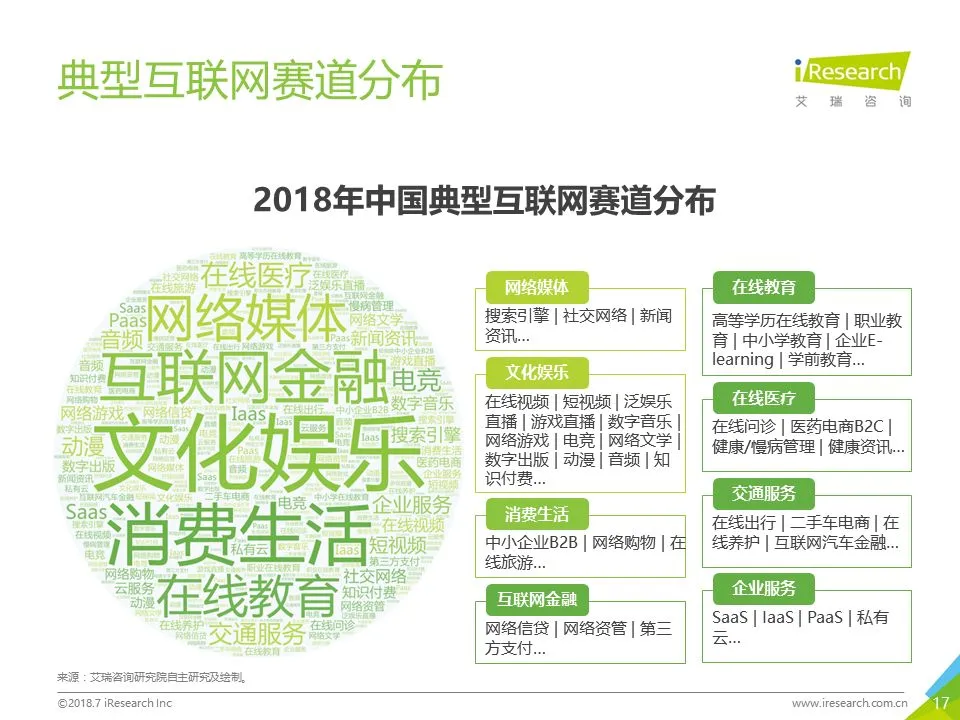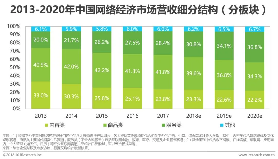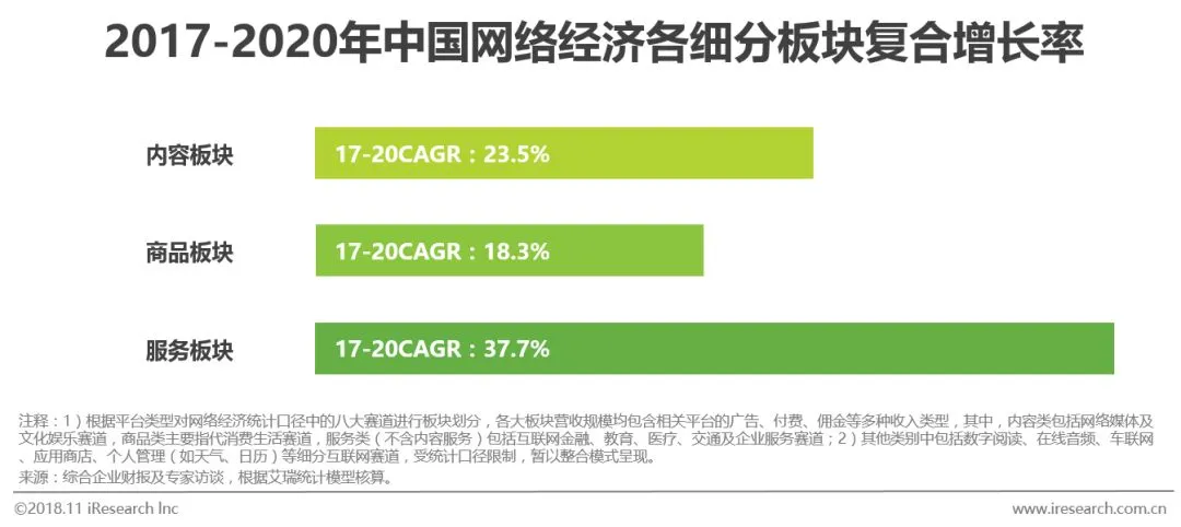 艾瑞咨询根据平台类型对网络经济中的八大赛道进行板块划分,其中,内容板块主要包括网络媒体及文化娱乐赛道,商品板块主要指代消费生活赛道,服务板块(不含内容服务)则主要包括互联网金融、教育、医疗、交通及企业服务赛道。
