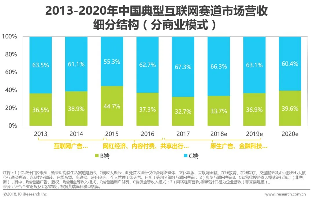 2017年,典型互联网赛道收入中,来自C端的收入比例达到67.3%,而B端的营收占比则接近32.7%,与2016年相比,C端营收的贡献率提升了接近五个百分点。互联网广告产业的快速发展促进了2013-2015年典型互联网赛道收入中B端营收比例的显著增长,而伴随着网红经济、内容付费、共享出行等赛道的发展,2015-2017年间,典型互联网赛道收入中的C端营收比例开始提升,未来,受到原生广告、金融科技等赛道扩张的影响,互联网B端营收占比还将再次扩大,预计到2020年,典型互联网赛道收入中,C端与B端收入将趋向于6:4的稳定结构。