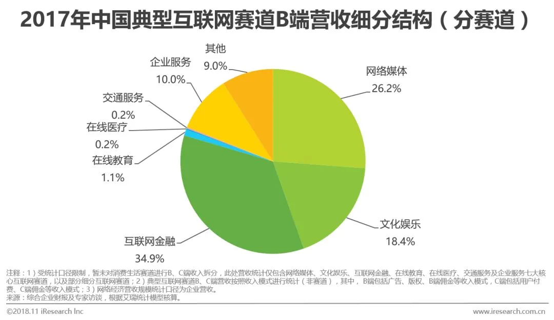 2017年,典型互联网赛道营收规模中,B端营收规模接近6963.6亿元,同比增速较2016年稍有回升,达到24.1%。其中,贡献率最高的三个赛道分别是互联网金融、网络媒体及文化娱乐,占比达到34.9%、26.2%和18.4%,合计份额接近八成。一方面,从严的互联网广告新规以及相关负面新闻对互联网广告市场产生的较大冲击已有所缓解,媒体及文娱行业发展环境转好;另一方面,金融科技相关产业快速发展,也促进了整体B端营收的提升。