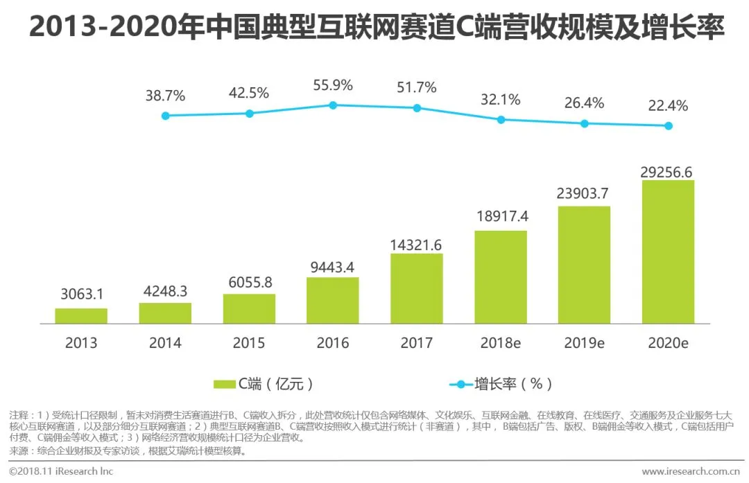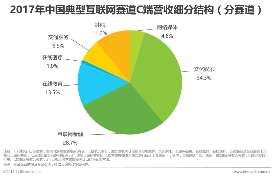 2017年,典型互联网赛道营收规模中,C端营收规模达到14321.6亿元,同比增速接近51.7%。其中,贡献率最高的两个赛道分别是文化娱乐和互联网金融,占比达到34.3%和28.7%。一方面,用户在手游、电竞及在线视频等方面的付费意愿的提升,以及对直播打赏接受度的提高,促进了文化娱乐行业C端收入的增长;另一方面,网络信贷及第三方支付的快速发展,也推动了整体C端营收的提升。