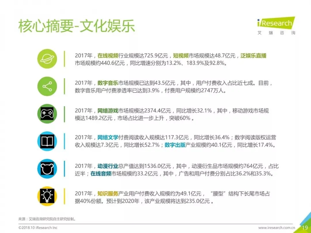 典型赛道-文娱: 2017年,文化娱乐赛道中,网游、动漫、视频、直播、网文等行业规模分别达到2374.4、1536.0、725.9、440.6、117.3亿元;知识服务、短视频、泛娱乐直播等行业同比增速分别达到287.9%、183.9%及92.8%。