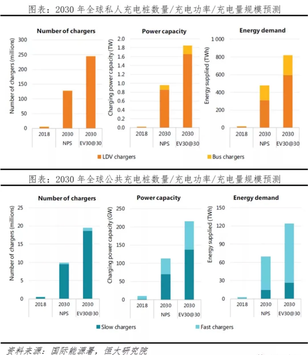 另外,从国际能源署IEA发布《Global EV Outlook 2019》报告和恒大研究院任泽平的研究上看,到2030年全球私人充电桩预计保有量分别达到12800-24500万台,总充电功率达1000-1800GW,总充电量达480-820TWh;公共充电桩预计保有量达到1000-2000万台,总充电功率113-215GW,总充电量70-124TWh。
